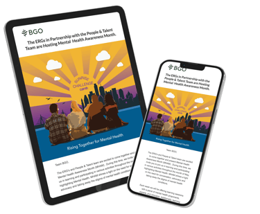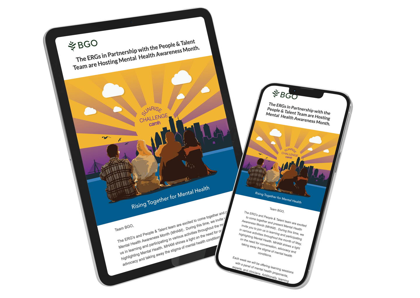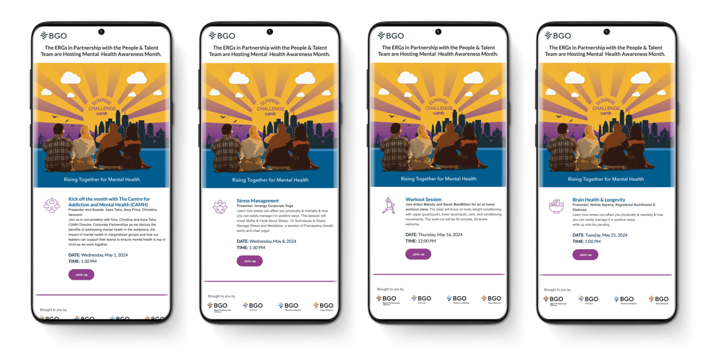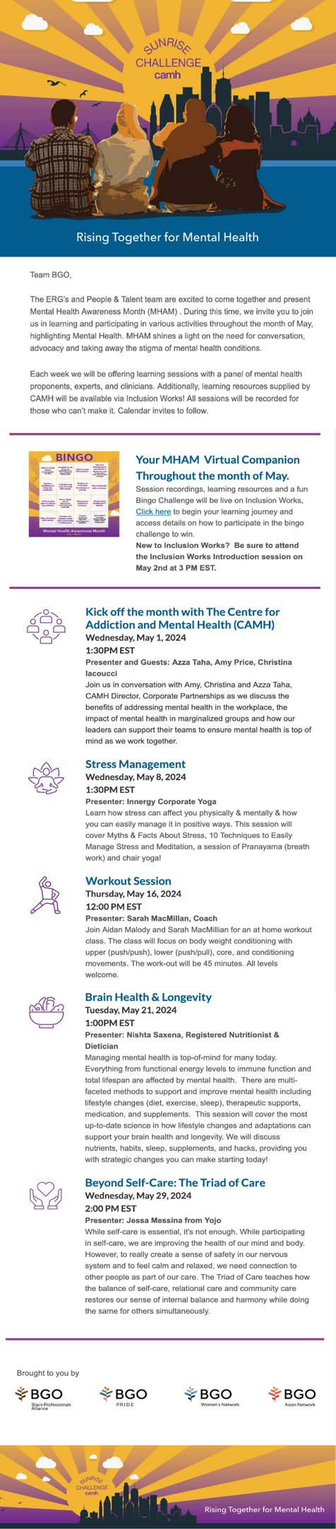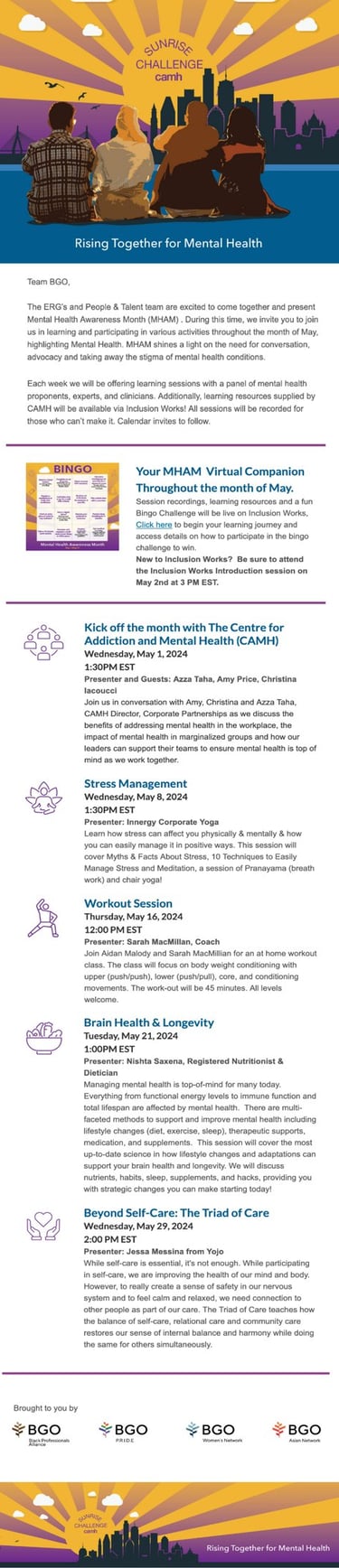 The Centre for Addiction and Mental Health (CAMH) is Canada’s largest mental health teaching hospital and one of the world’s leading research centres in its field. BGO's employee Resource Groups (ERGs), accessible to all employees across the globe, and the People & Talent Team, partnered with CAMH to host the Mental Health Awareness Month.